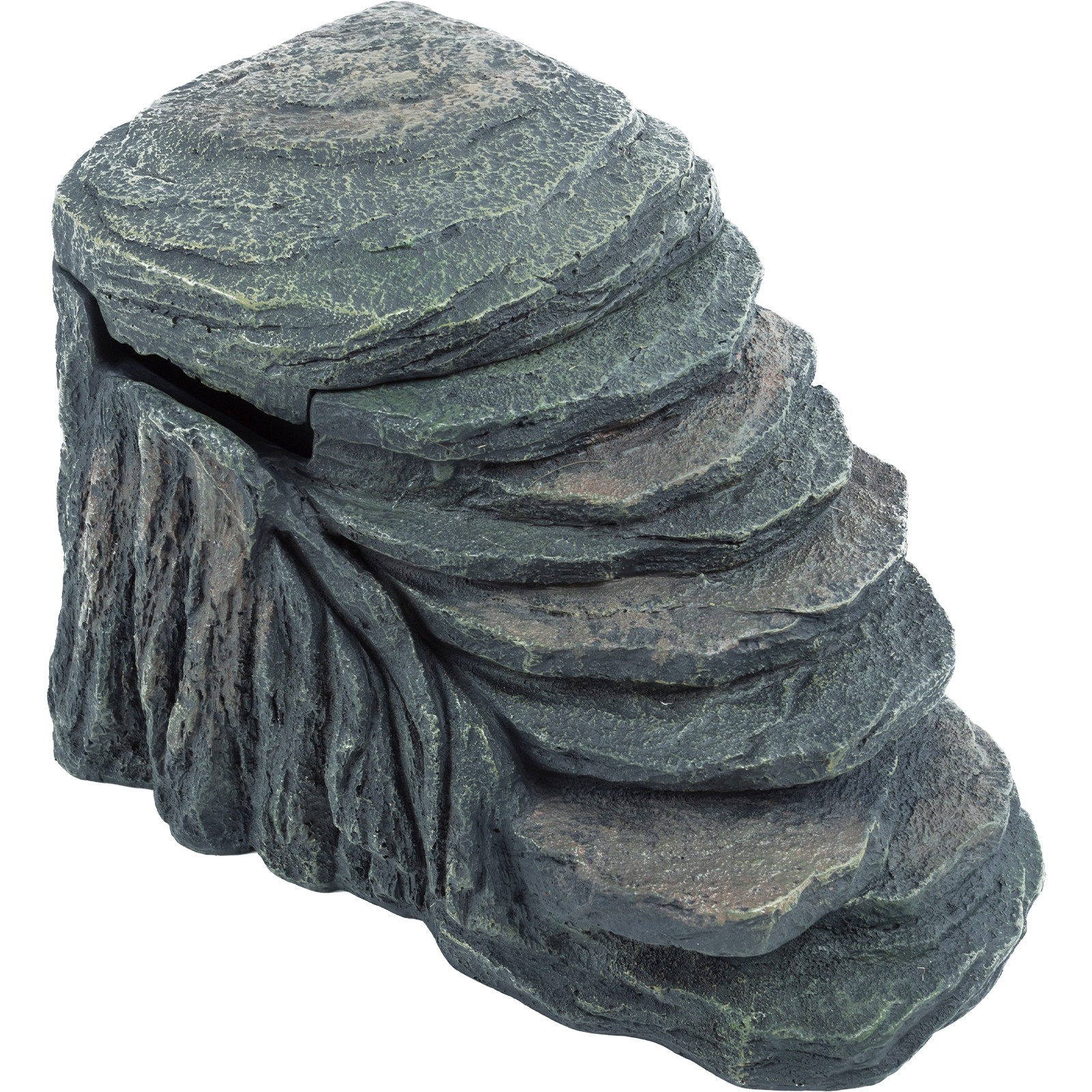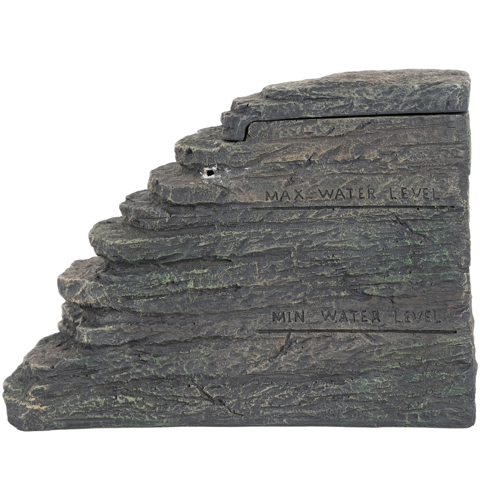 Dzięki sprytnemu projektowi umieszczonemu w narożniku zbiornika, wyspa nie zabiera zbyt wiele miejsca, a jej naturalny wygląd doskonale komponuje się z otoczeniem. Żółwie mogą łatwo wspiąć się po schodkach na platformę górną na kąpiele słoneczne, a zintegrowany system filtracyjny dba o krystalicznie czystą wodę.