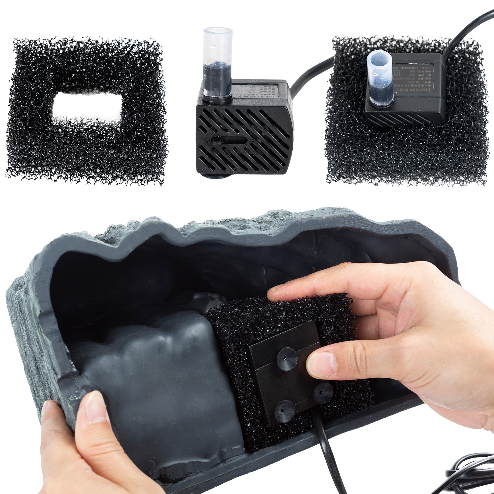 Na dole wyspy znajduje się pompa o wydajności 350 l/h ze wstępną gąbką zatrzymującą większe zanieczyszczenia. Następnie woda przechodzi przez górny filtr wieloetapowy: wkład z drobną włókniną mechaniczną, warstwę z węglem aktywnym (chemiczna filtracja) i sekcję biologiczną dla pożytecznych bakterii. Oczyszczona woda spływa elegancko wodospadem z góry wyspy, tworząc nie tylko spektakularny efekt wizualny, ale i stały obieg wody.