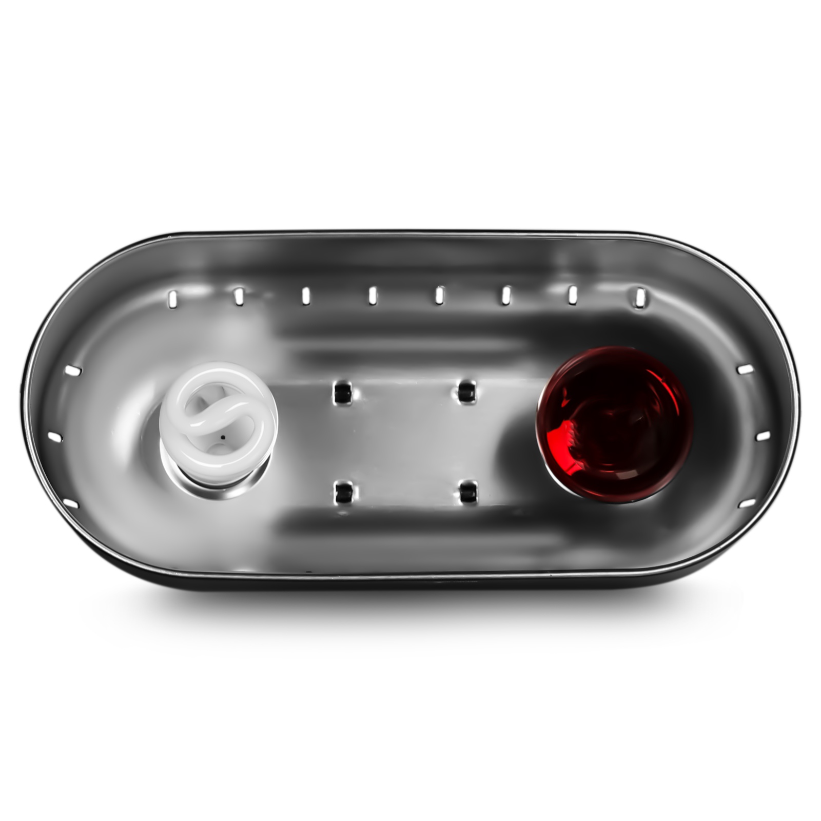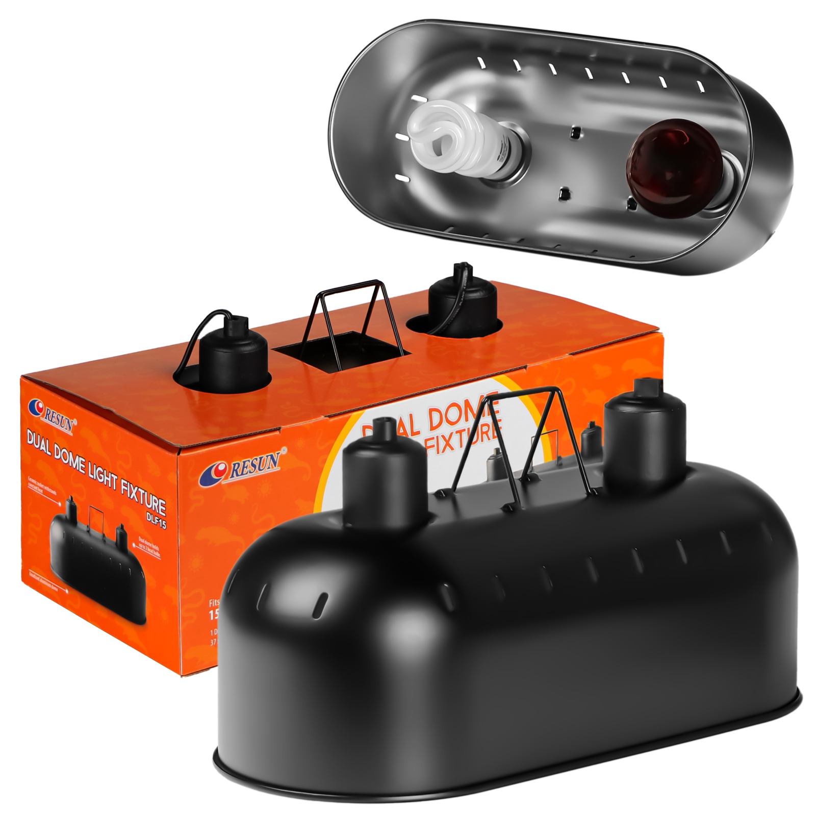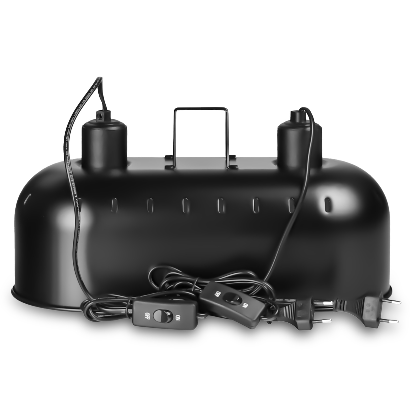 Wewnątrz są dwie oprawki na żarówki, każda posiada swój kabel z włącznikiem. Zastosuj jednocześnie żarówkę grzewczą i UVB, albo grzewczą dzienna i nocną - wykorzystaj jak chcesz - to spore udogodnienie i ułatwioenie kompletowania odpowiedniego rozbudowanego oświetlenia i ogrzewania do terrarium.