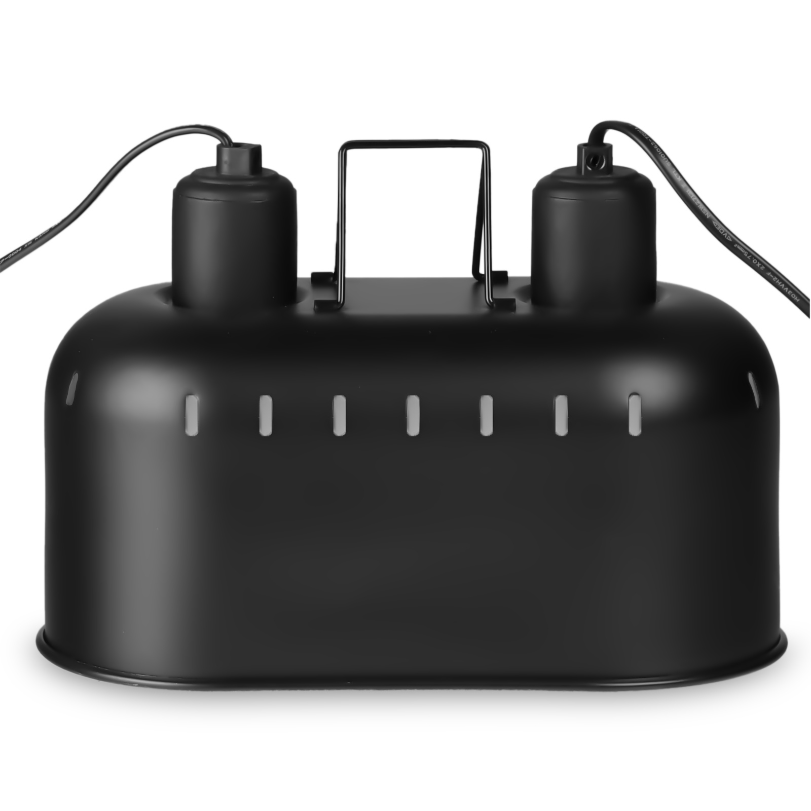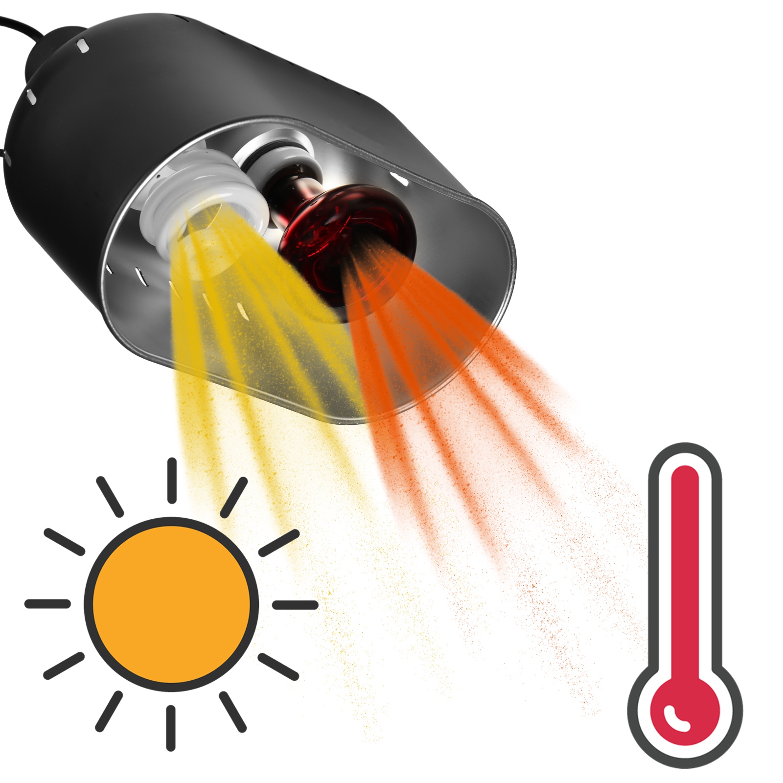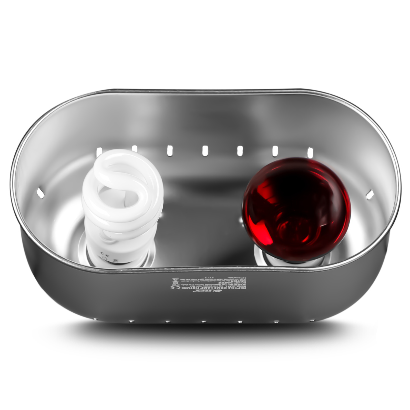 Wewnątrz są dwie oprawki na żarówki, każda posiada swój kabel z włącznikiem. Zastosuj jednocześnie żarówkę grzewczą i UVB, albo grzewczą dzienna i nocną - wykorzystaj jak chcesz - to spore udogodnienie i ułatwioenie kompletowania odpowiedniego rozbudowanego oświetlenia i ogrzewania do terrarium.
