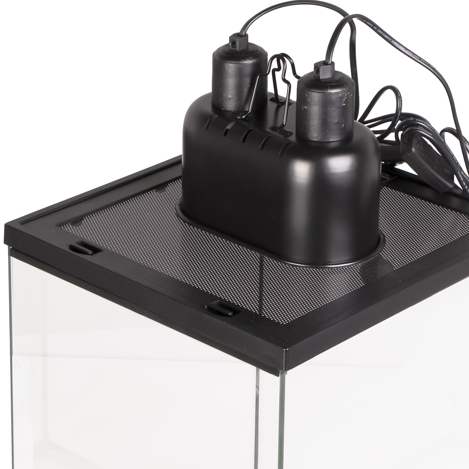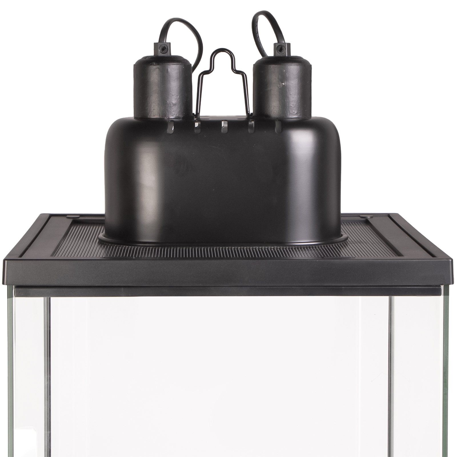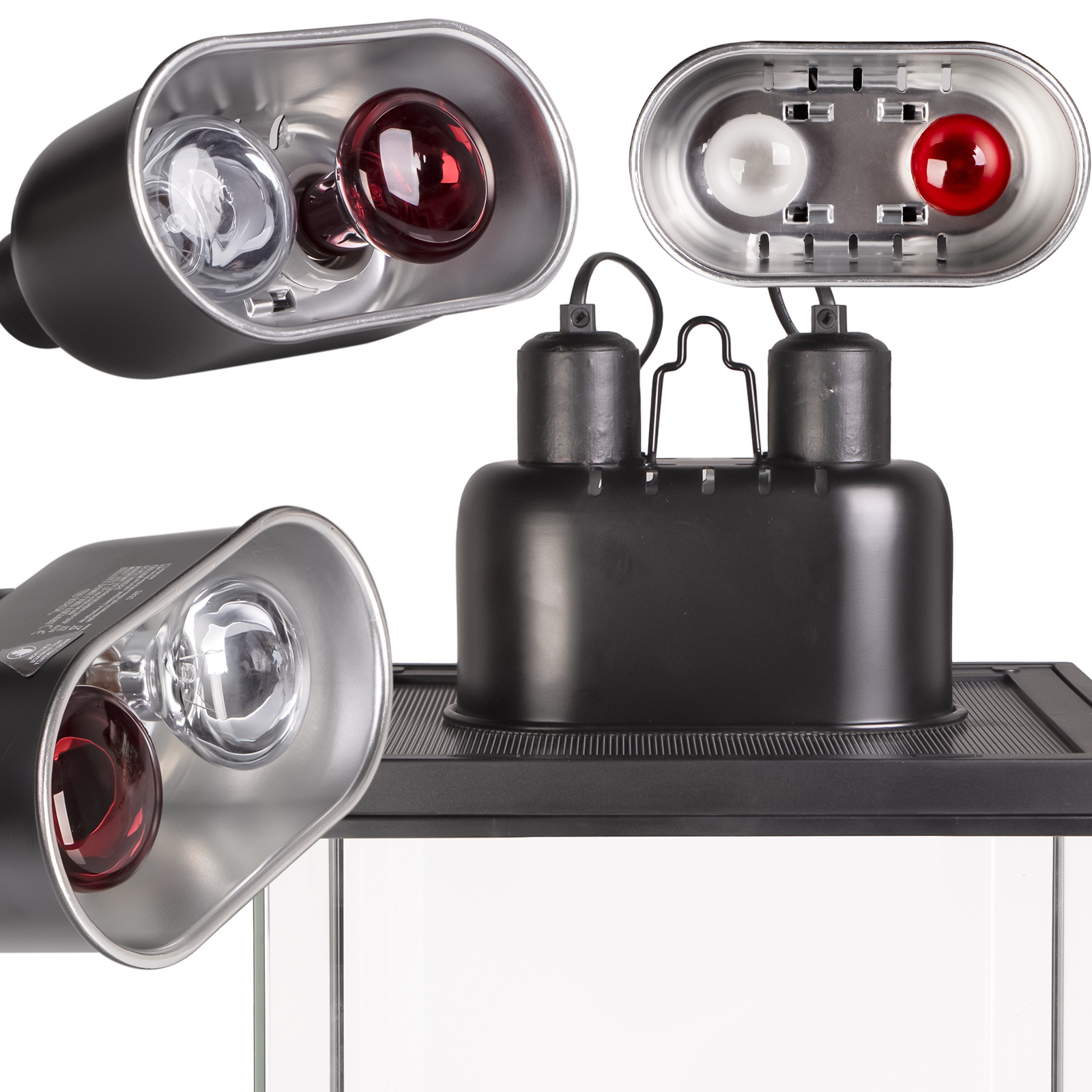 - podwójne oprawki: Umożliwia zamontowanie dwóch żarówek grzewczych, UVB (tylko małych żarówek UVB) lub ich kombinacji, co zapewnia elastyczność w tworzeniu stref oświetlenia i ciepła.