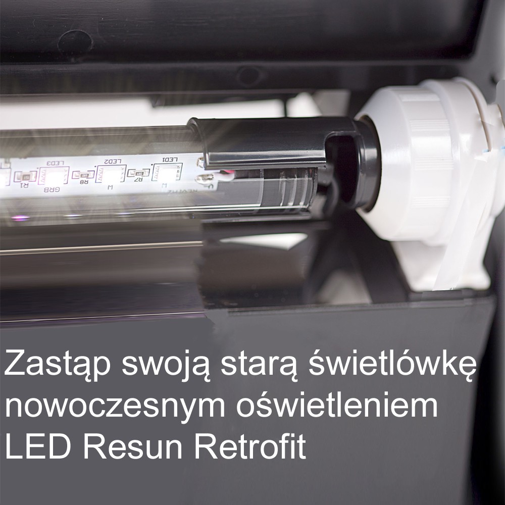 Dodatkowo, jedynie lampa Resun Aqua Syncro umieszczona jest wewnątrz szklanej tuby z szkła o najwyższej wodoszczelności i przejrzystości. Rozwiązanie takie nie blokuje przepływu światła, a co więcej nie matowieje z czasem jak tuby plastikowe konkurencyjnych Retro Fit'ów.