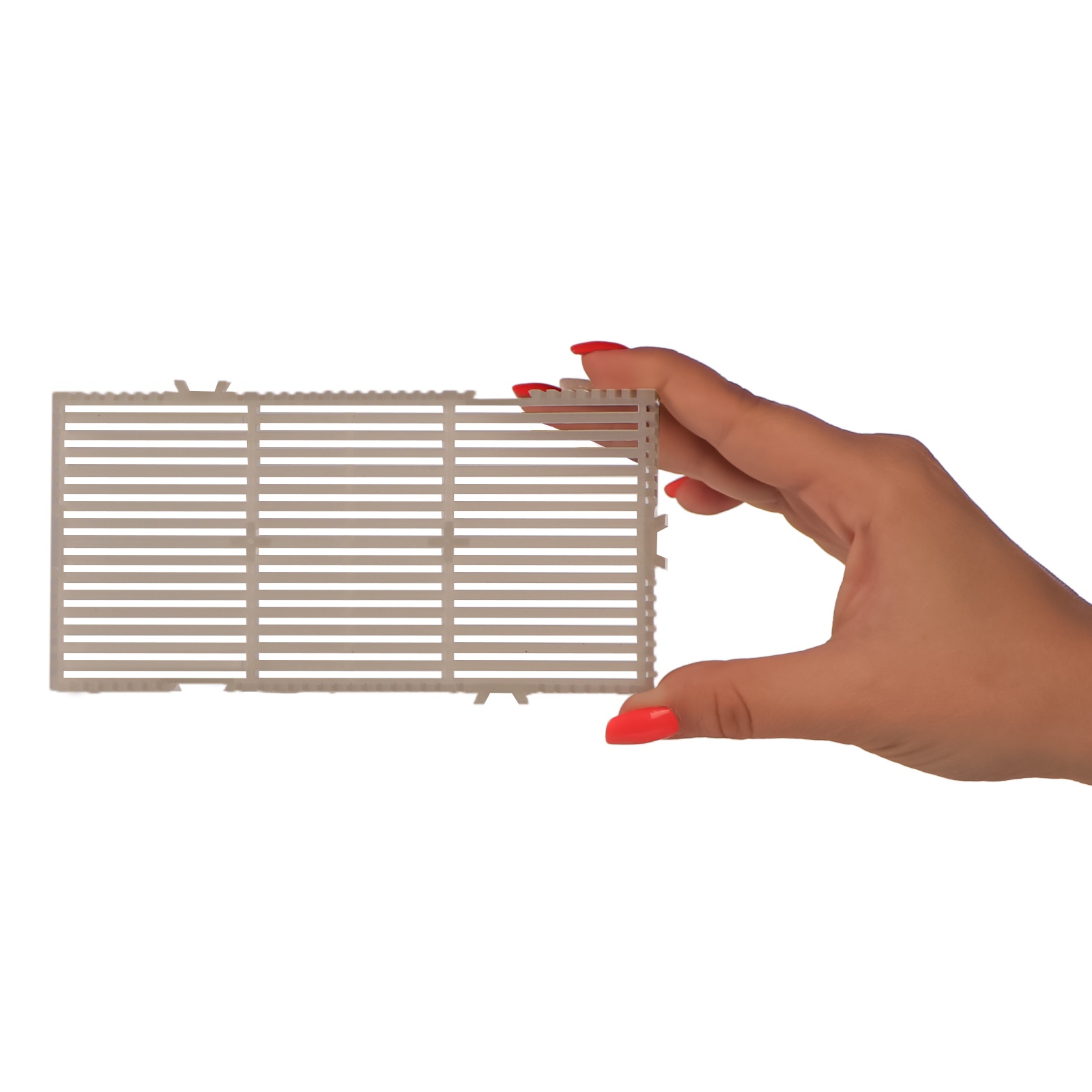 Kratkownica filtra składa się z pojedynczych elementów o wymiarach 14x7cm. Możesz je swobodnie łączyć ze sobą dopasowując tym samym wymiary filtra podżwirowego do Twojego akwarium. Po ułożeniu możesz uciąć nadmiarowe łączniki kloców aby otrzymać dokładne wymiary. UWAGA! poszczególne klocki można również łączyć prostopadle do siebie!