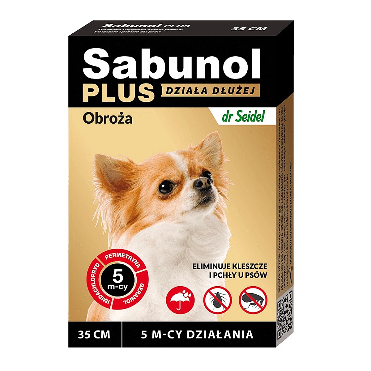 Sabunol PLUS to nowoczesna obroża przeciw kleszczom i pchłom dla psów. Nowa technologia produkcji i inna forma paska obroży zapewnia równomierne oraz długotrwałe uwalnianie się trzech składników aktywnych: permetryny, imidachloprydu i geraniolu. Dzięki temu obroża jest skuteczna przez 5 miesięcy. Badania potwierdzają wysoką tolerancję miejscową i ogólną co sprawia, że obroża jest bezpieczna podczas stosowania. Efekty działania obroży są już widoczne po 5 godzinach od jej założenia.