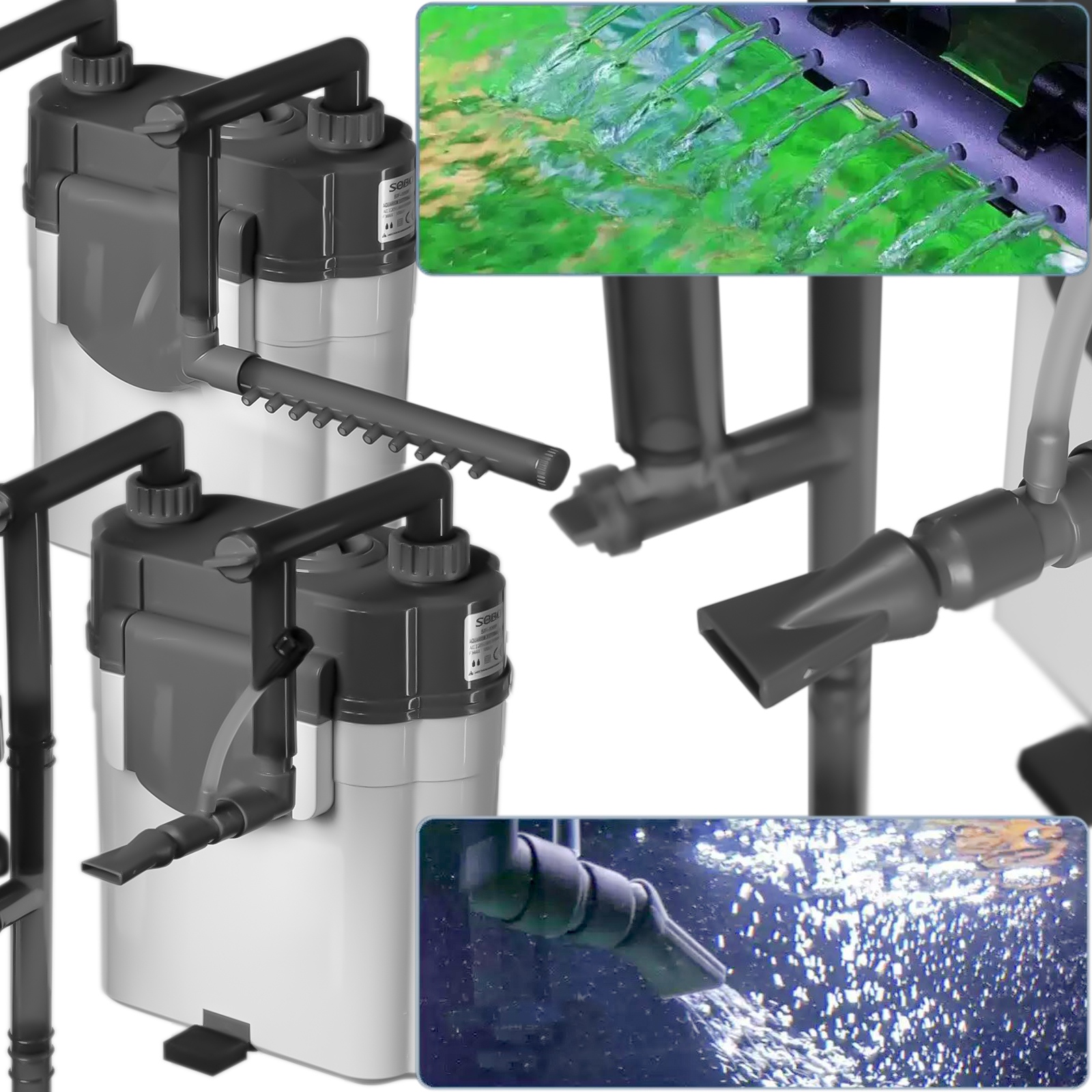 Filtry kubełkowe SF zostały stworzone z myślą o jak najlepszej filtracji, poprzez dużą objętość. Jednocześnie konstrukcja filtra umożliwia umieszczenie go poza zbiornikiem, na krawędzi szkła, oszczędzając w ten sposób miejsce w akwarium, w szafce lub pod akwarium. Takie cechy filtra znacznie przewyższają filtry wewnętrzne, kaskadowe i standardowe zewnętrzne. Zapewniają lepsza filtrację niż wewnętrzne i kaskadowe oraz są łatwiejsze w obsłudze i nie zabierają tyle miejsca co standardowe filtry zewnętrzne