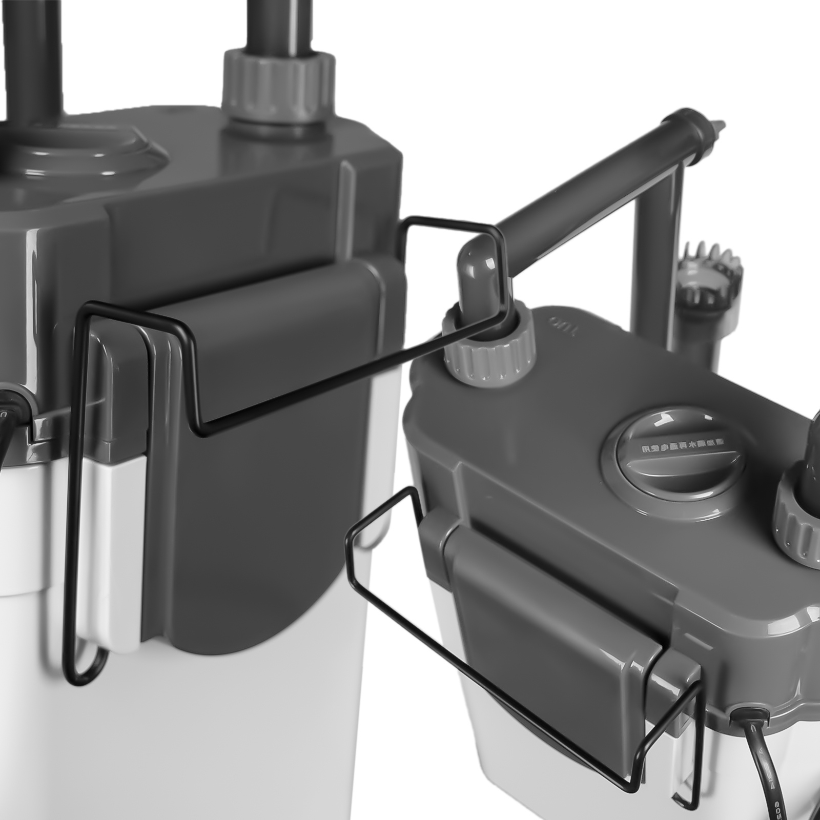 Filtr umieszczany jest na krawędzi zbiornika za pomocą specjalnych wieszaków. Uchwyty te umożliwiającą dopasowanie ich do grubości szkła w zakresie od 4mm do 20mm. Specjalna stopka utrzymuje filtr w pionie. Wykonanie jej z elastycznej i miękkiej gumy doskonale tłumi drgania powstałe z pracy wirnika i przepływu wody czyniąc filtr niesłyszalnym.