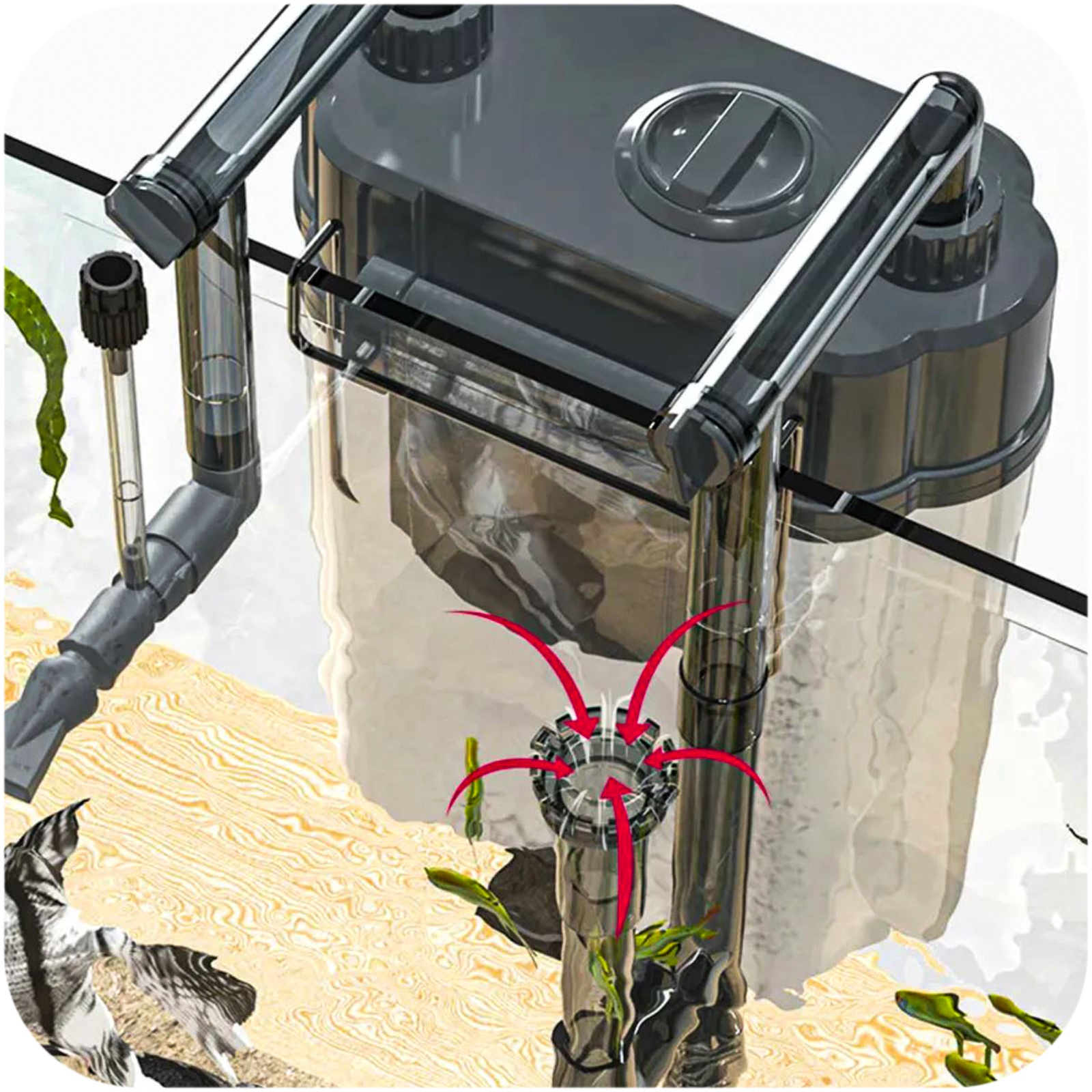 Wlot wody do filtra odbywa się za pomocą rurki o regulowanej długości, przy pomocy trzech segmentów. Tym sposobem filtr zasysa nieczystości zalegające na dnie, które są częstą przyczyną zamulenia dna i pogorszenia się jakości wody. Wlot posiada specjale sitko zabezpieczające przed zasysaniem ryb, krewetek itp. Do tego wlot odbywa się za pomocą skimmer, czyli wlot wody przy powierzchni. Oczyszczamy w ten sposób taflę wody z tłuszczy i zanieczyszczeń. Intensywność tego wlotu jest regulowana. Długości rurek szukaj w danych technicznych na końcu opisu.