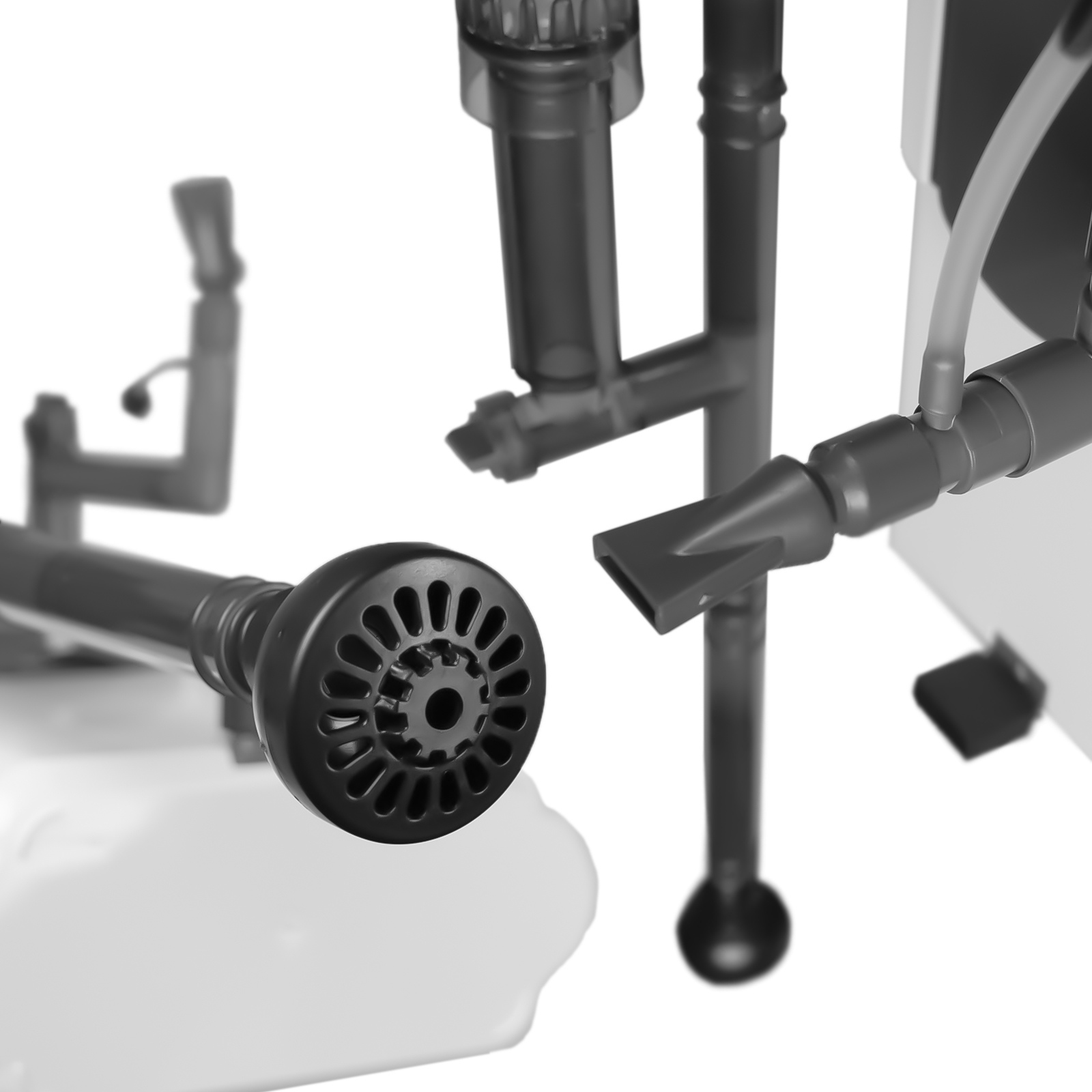 Wylot posiada dwie wymienne końcówki. Spłaszczona końcówka wylotu (podobna do loc-line) doskonale wzbudza odpowiedni ruch wody oraz posiada kulowy przegub umożliwiający skierowanie strumienia w dowolnym kierunku. Dodatkowo wyposażona jest w wężyk napowietrzający, który dostarcza sporą ilość tlenu dla ryb. Wylot deszczownica przyda się jako napowietrzenie wody oraz do stworzenia niezbyt dużego ruchu wody, który jest niepotrzebny w małych akwariach.