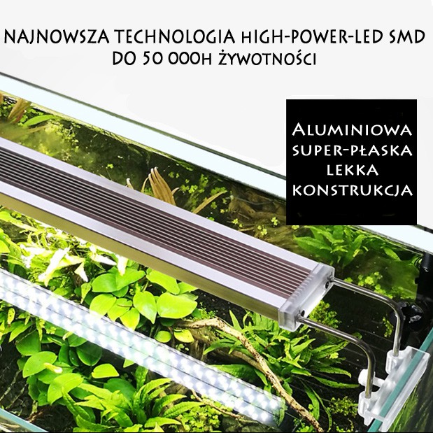 Kąt świecenia wynosi 120 stopni, co pozwala oświetlić duży obszar powierzchni akwarium za pomocą jednego urządzenia.
