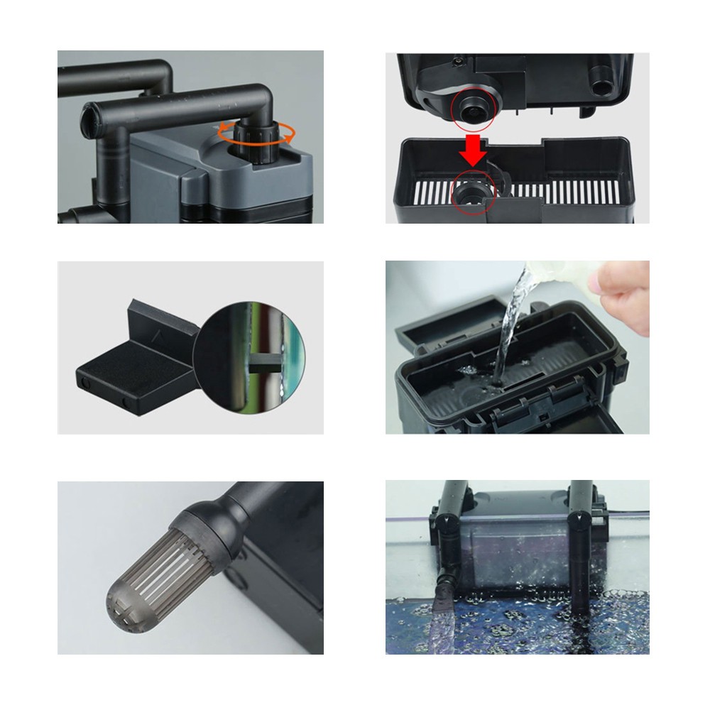 Filtr umieszczany jest na krawędzi zbiornika za pomocą specjalnych wieszaków. Uchwyty te posiadają regulację umożliwiającą dopasowanie ich do grubości szkła w zakresie od 4mm do 20mm. Specjalna stopka utrzymuje filtr w pionie. Wykonanie jej z elastycznej i miękkiej gumy doskonale tłumi drgania powstałe z pracy wirnika i przepływu wody czyniąc filtr niesłyszalnym.