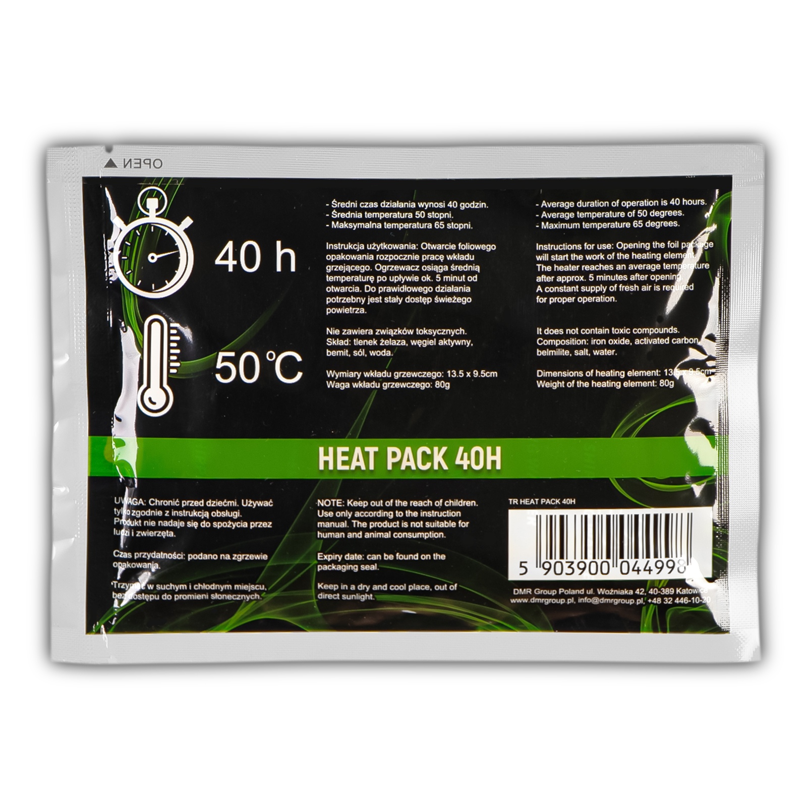 Po otwarciu rozgrzewa się do 50st.C i utrzymuje tą temperaturę przez okres 40 godzin. Jest łatwy w użyciu, a nie toksyczny wkład nie stanowi zagrożenia dla ludzi i zwierząt nawet w przypadku roztargania produktu.