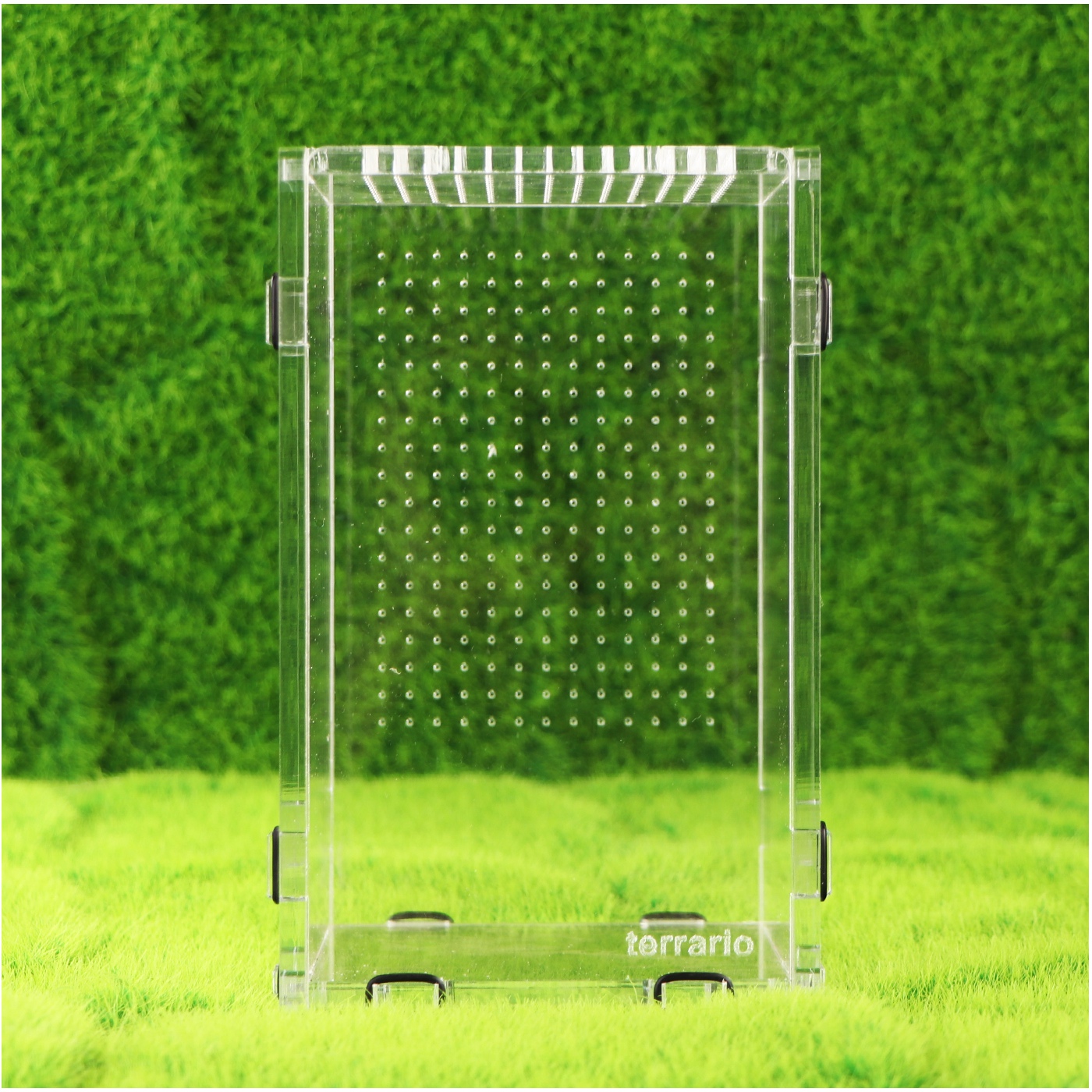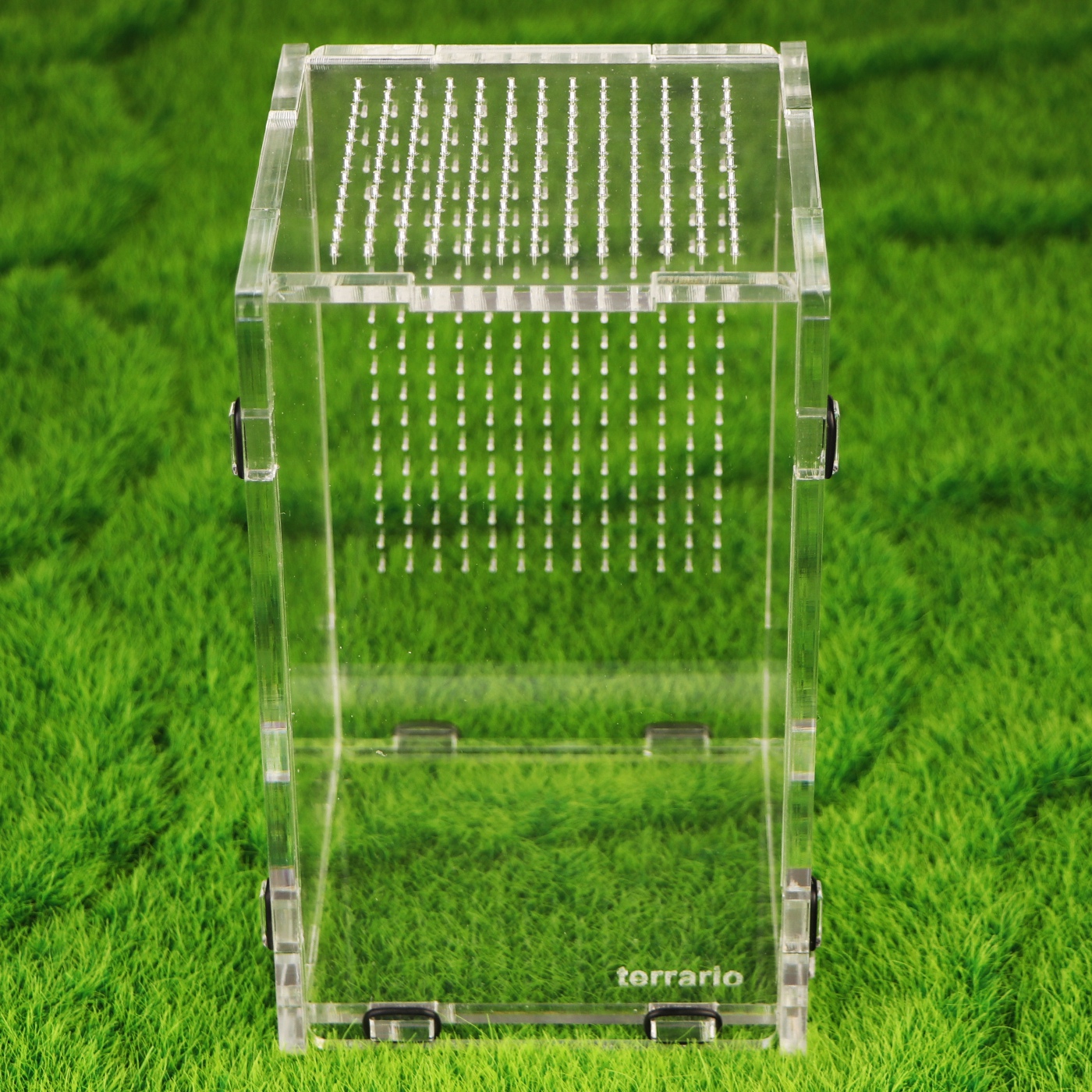 Pokrywka jak i ścianka tylna posiada mikro perforacje. Odpowiada ona za prawidłową cyrkulację powietrza wewnątrz pojemnika. Średnica otworów to 0.9mm uniemożliwia ucieczkę nawet najmniejszym owadom (np: młode patyczaki)