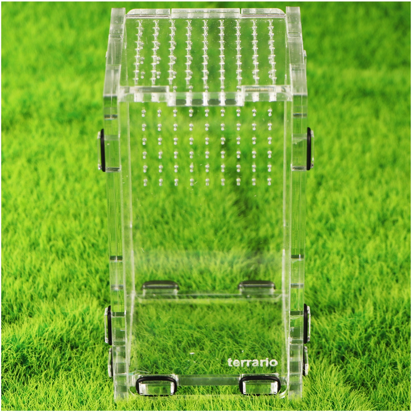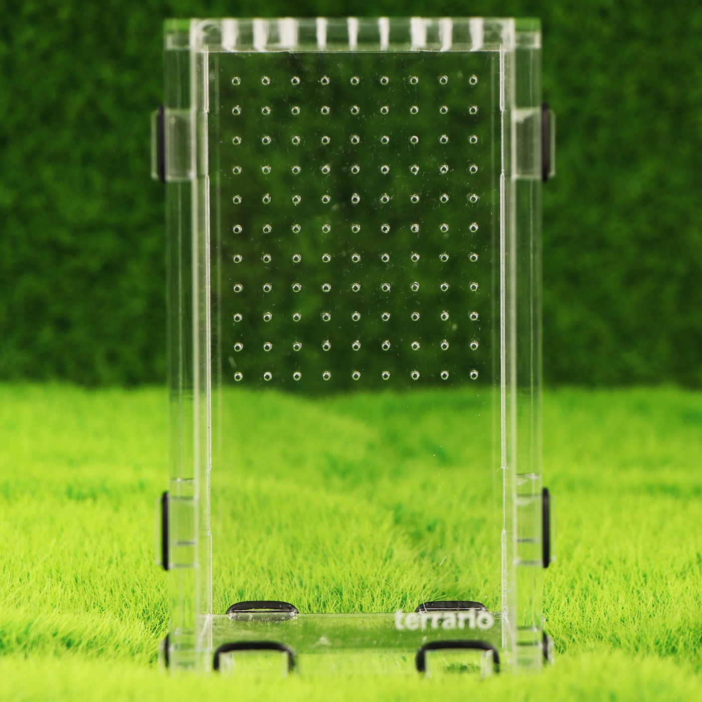 Pokrywka jak i ścianka tylna posiada mikro perforacje. Odpowiada ona za prawidłową cyrkulację powietrza wewnątrz pojemnika. Średnica otworów to 0.9mm uniemożliwia ucieczkę nawet najmniejszym owadom (np: młode patyczaki)