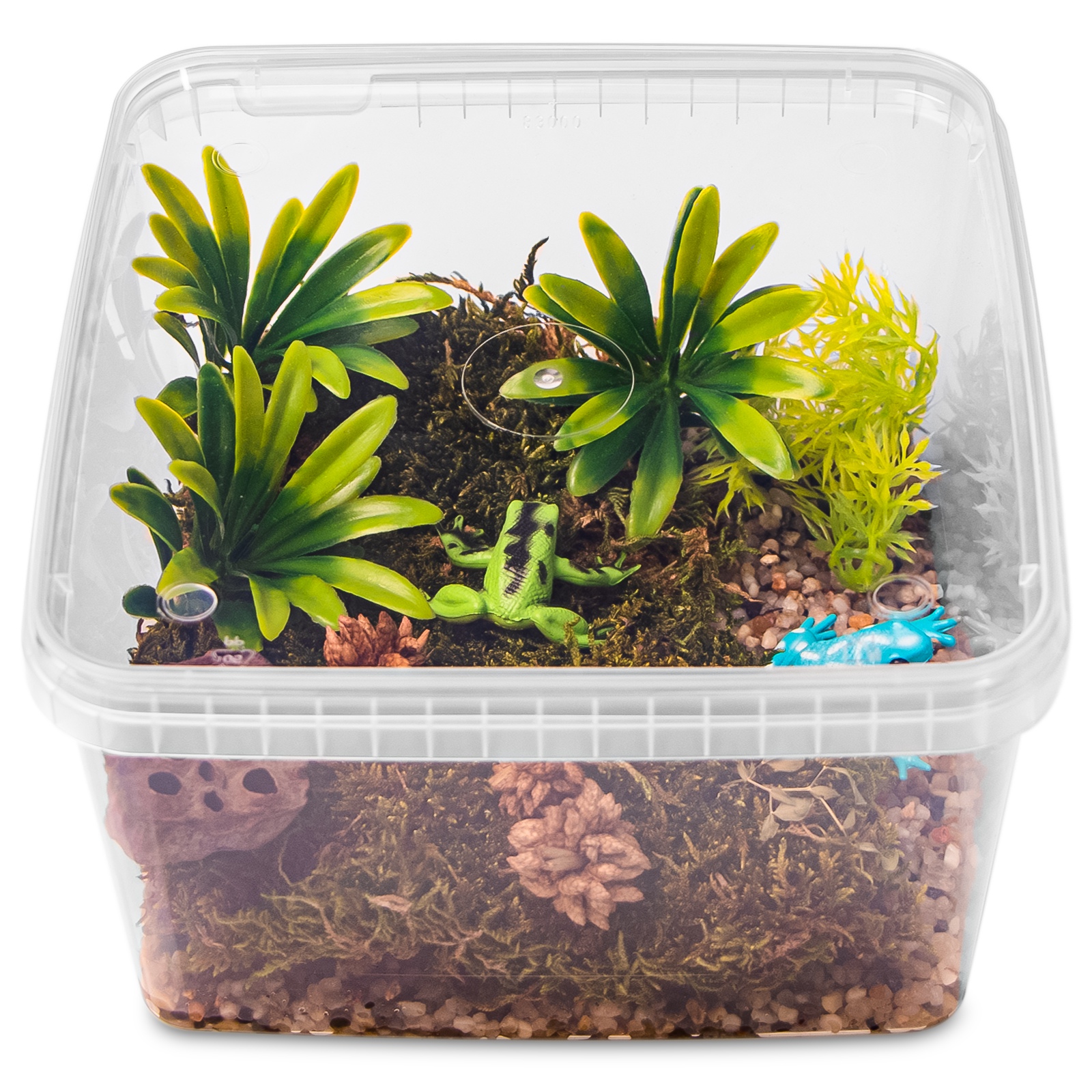 Terrarium - pojemniki plastikowe dla gadów są popularne ze względu na swoją prostotę i niski koszt. Są również proste w utrzymaniu i stosunkowo łatwe w przenoszeniu. Terrarium zapewnia warunki hodowlane dla większości owadów oraz małych płazów czy gadów. Dodatkowo produkt można wykorzystać do hodowli roślin oraz żywej karmy.