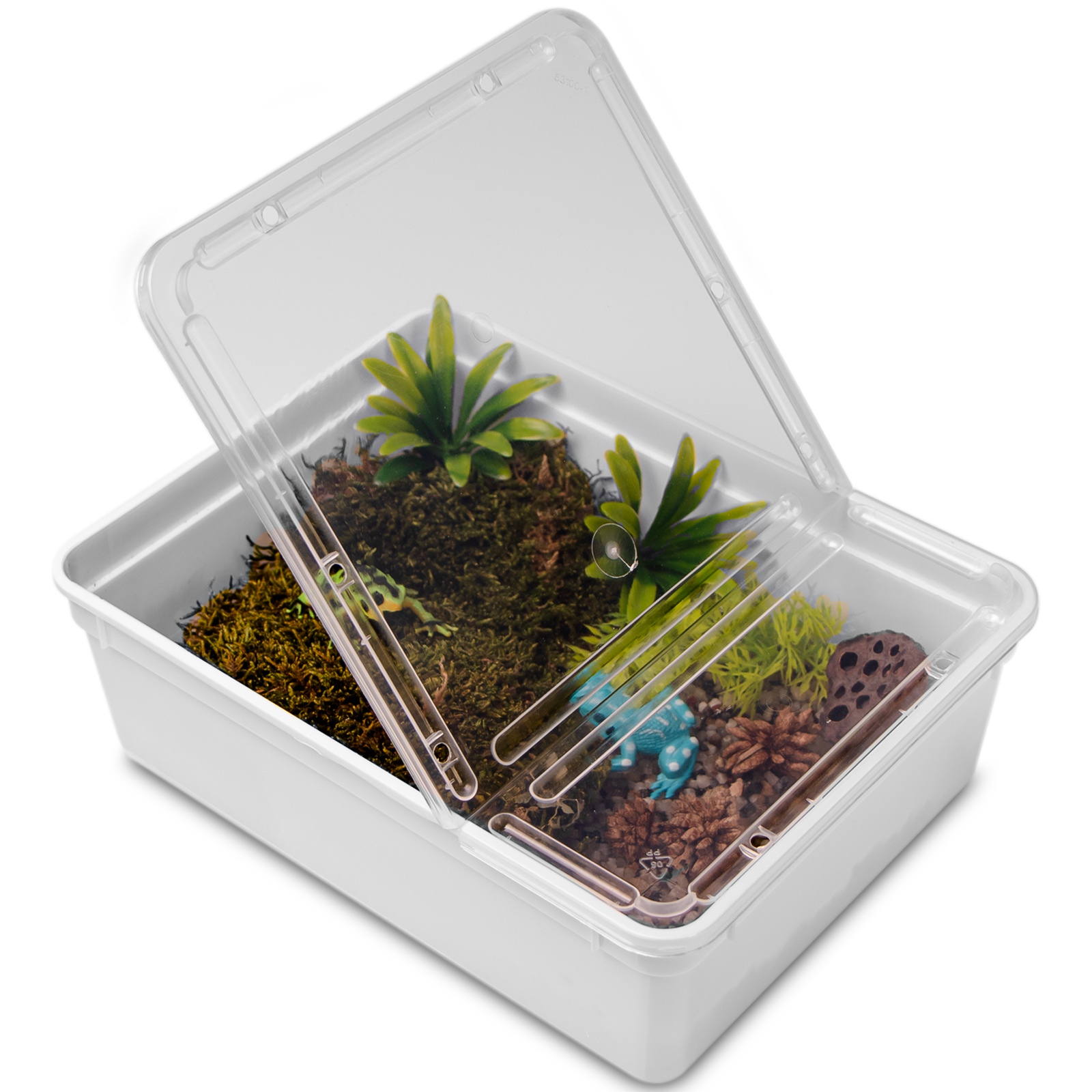 Terrarium - pojemniki plastikowe dla gadów są popularne ze względu na swoją prostotę i niski koszt. Są również proste w utrzymaniu i stosunkowo łatwe w przenoszeniu. Terrarium zapewnia warunki hodowlane dla większości owadów oraz małych płazów czy gadów. Dodatkowo produkt można wykorzystać do hodowli roślin oraz żywej karmy.