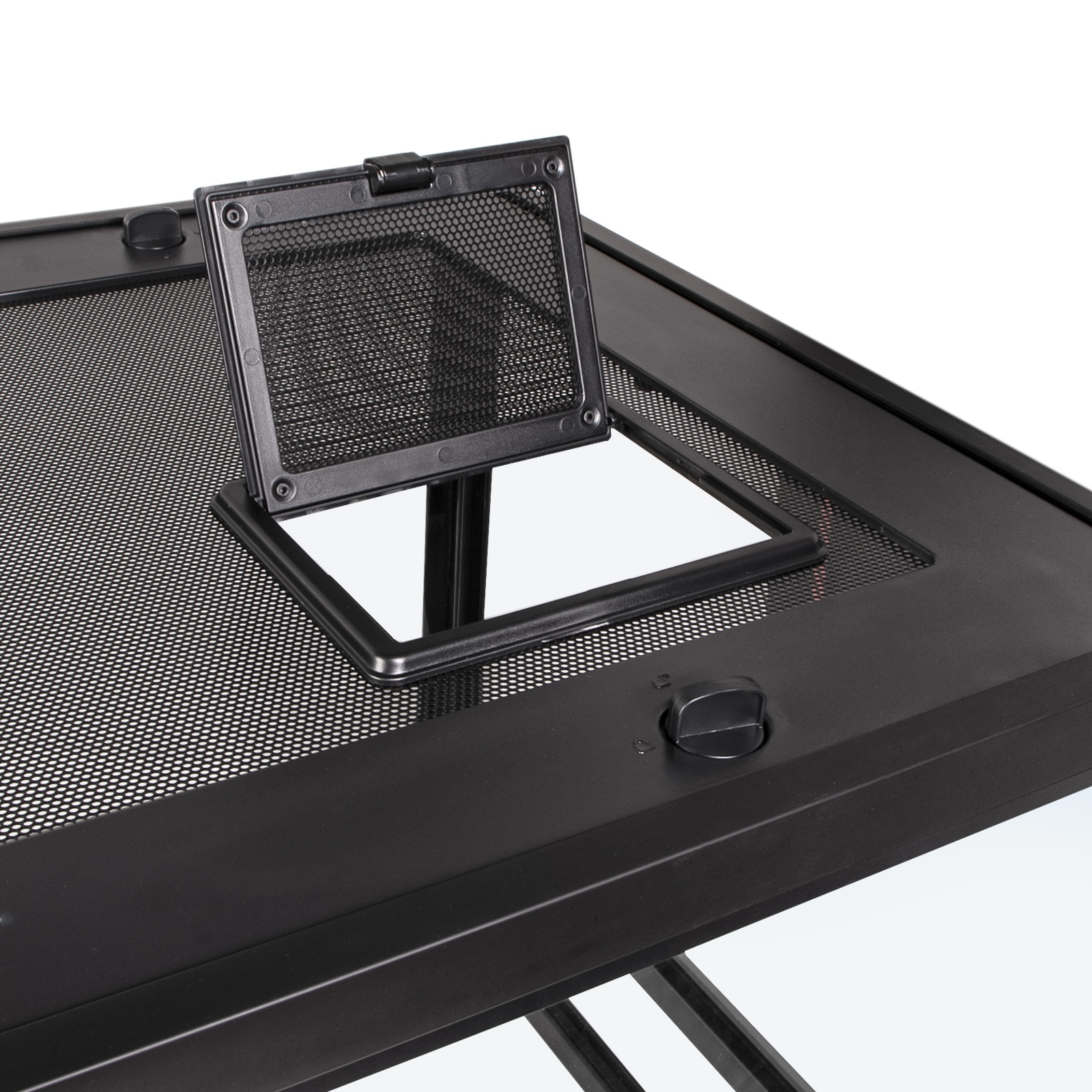 - Praktyczne rozwiązania dla wygody: pokrywa wyposażona jest w otwory na przewody zasilające z zaślepkami, które można zamknąć, gdy nie są używane, oraz osobny otwór do karmienia.