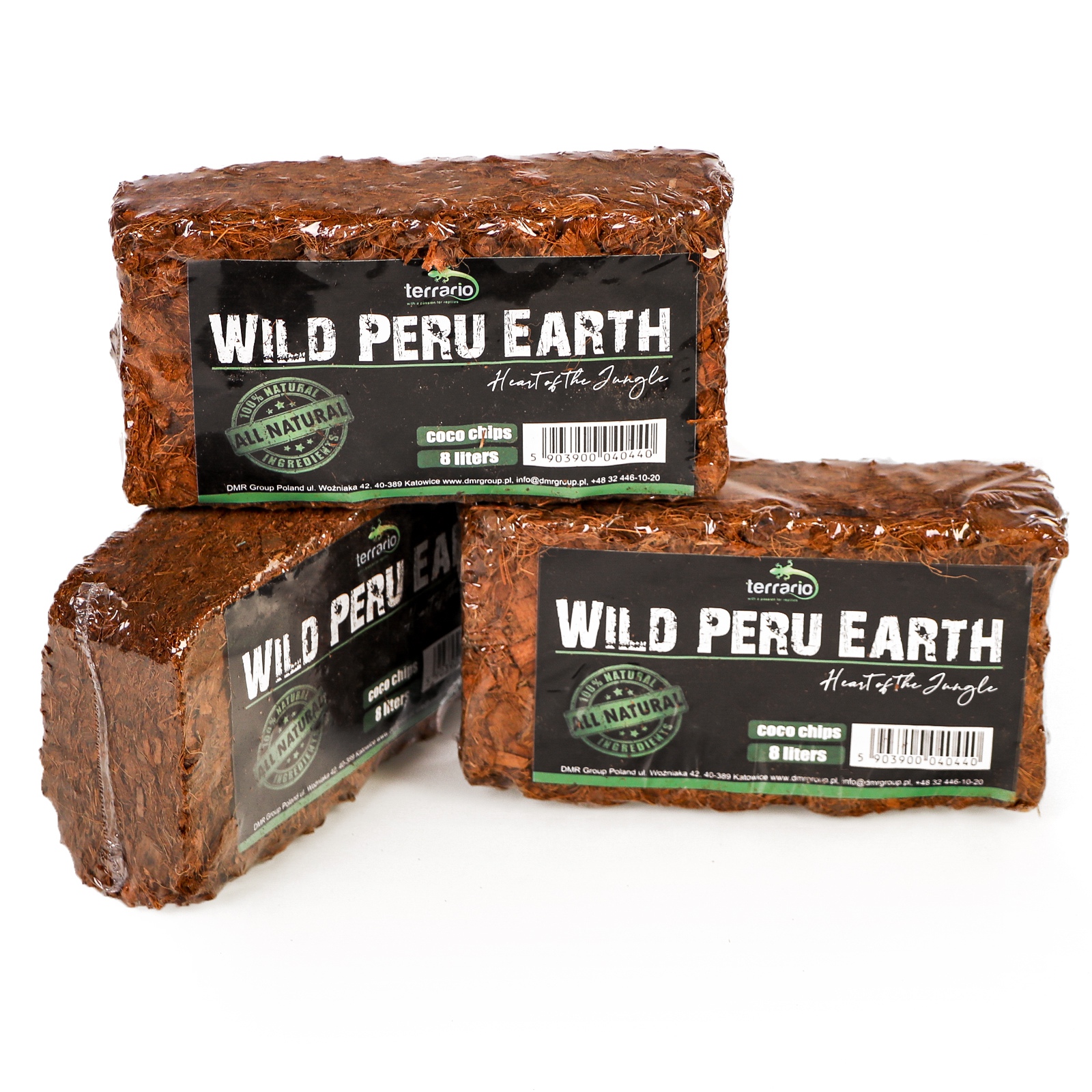- Wild Peru Earth: Zrębki kokosa. Podłoże dla średnich i dużych zwierząt, a dodatkowo dla świetne dla pajęczaków. (żółwie węże, ssaki, avicularia) Terrarium wilgotne lub suche. Uzupełnienie do wystroju lasu.