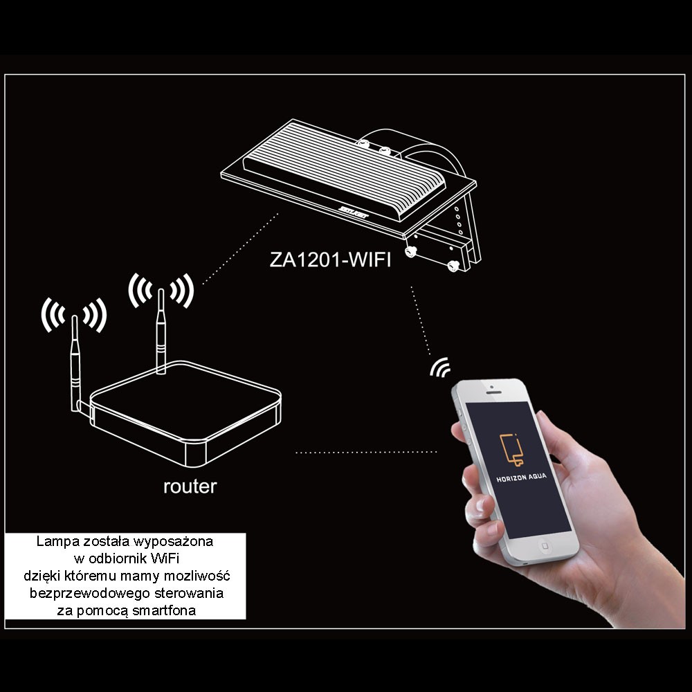 Lampa Zetlight AQUA 1201 WiFi jest przystosowana do współpracy platformą HORIZON, który pozwala w pełni wykorzystać jej potencjał oraz łączy w sobie możliwość sterowania innymi urządzeniami. HORIZON umożliwia 32-stopniową regulacje natężenia światła oraz możliwość zaprogramowania pięciu pór dnia: świt, wschód słońca, zenit, zachód słońca i zmierzch.